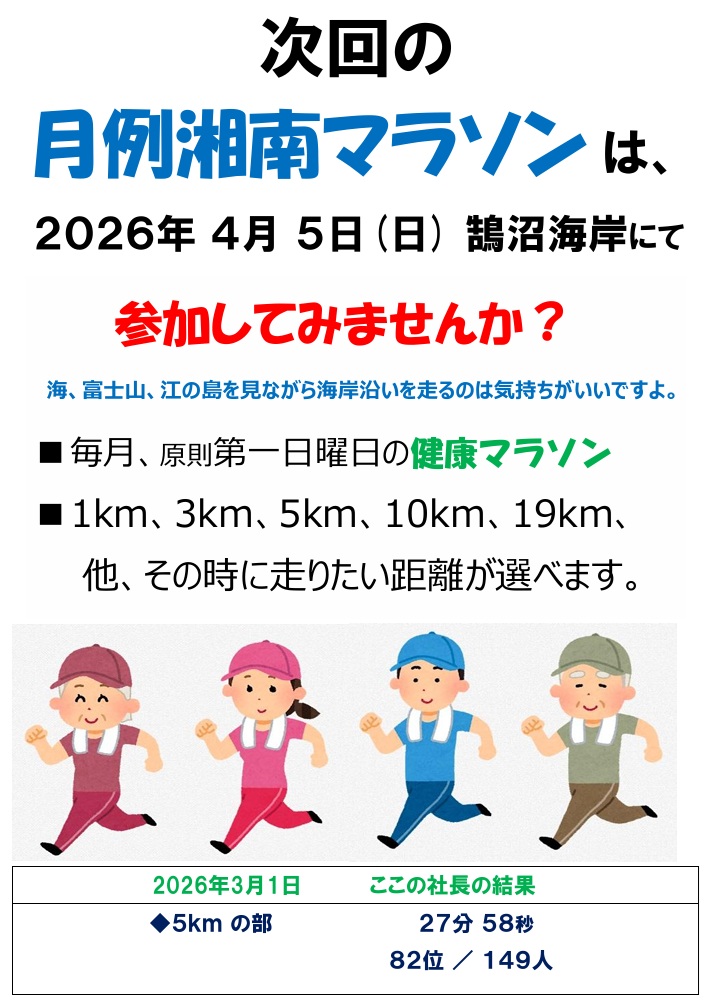 私は、毎月(原則)第一日曜日に月例湘南マラソンに参加しています。難病により長年、大量の血液凝固剤、止血剤の服用からくる後遺症に悩まされていました。27才のとき、このままでは長く生きられないと思い、毎朝ジョギングをすることにしました。数年後、難病は奇跡的に完治。雨の日も多少の熱があっても毎朝欠かさず2~3km走って35年目、病気を治すコツ・健康のコツを少し知りました。病気で苦しむ方々に何かのきっかけになればと思い、月例湘南マラソンに参加することにしました。また、毎日何かを積み重ねることで夢が実現できたり、あり得ない確率の良い出来事が起きるしくみをご縁があった方々にお伝えしたいと思っています。竹野