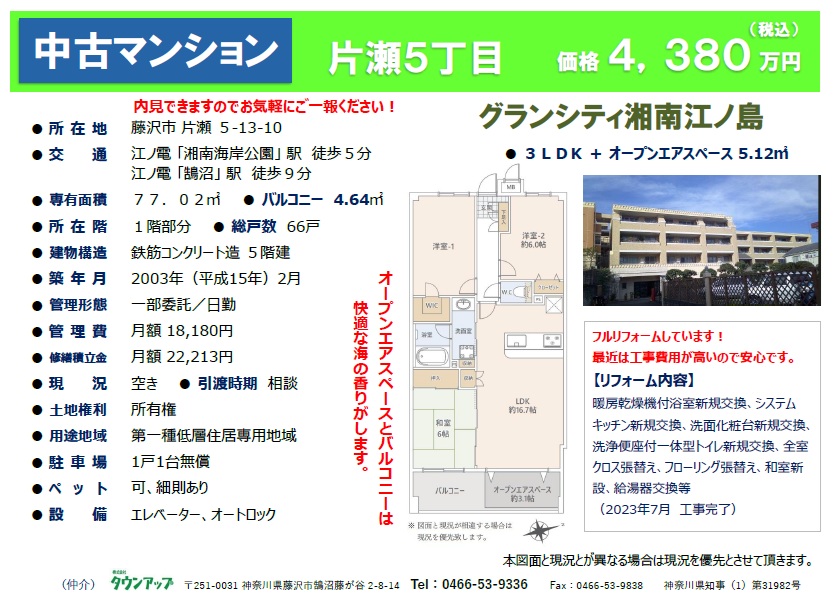 中古マンション(売買) グランシティ湘南江ノ島・1F・4,380万円