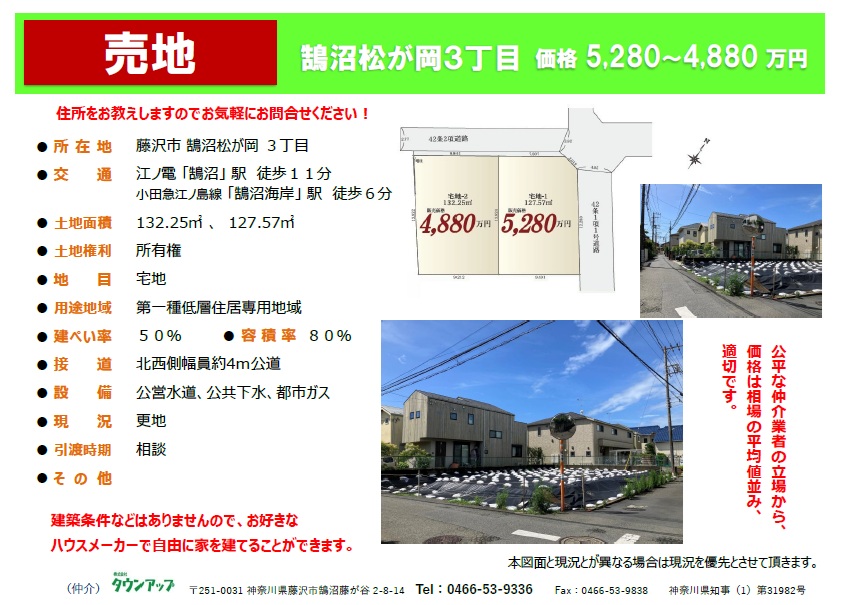 土地(売買)鵠沼松が岡3丁目・2区画・5,280~4,880万円