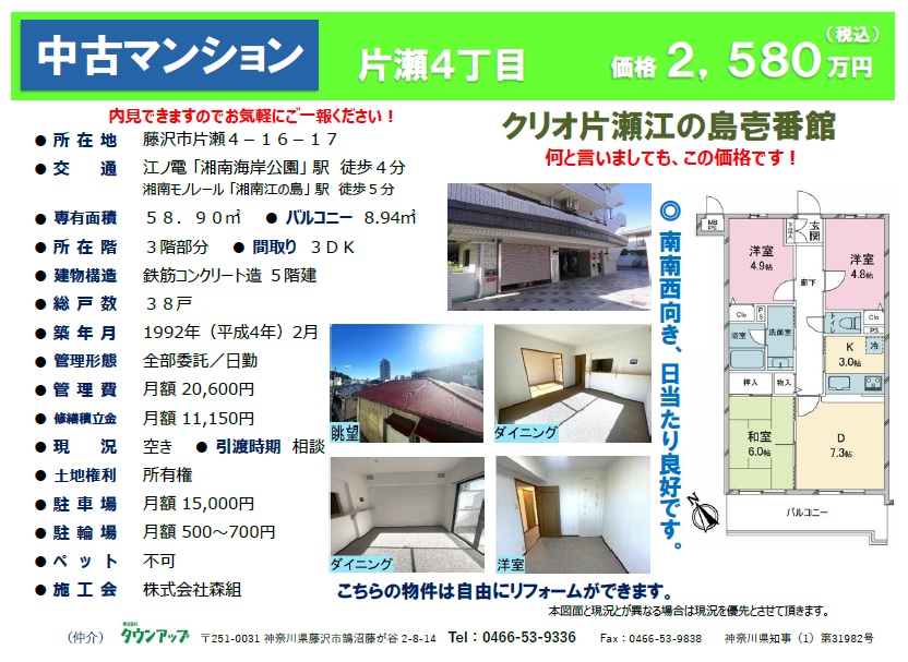 中古マンション(売買) クリオ片瀬江の島壱番館・3F・2,580万円・日当り眺望良好・1992年(平成4年)2月築