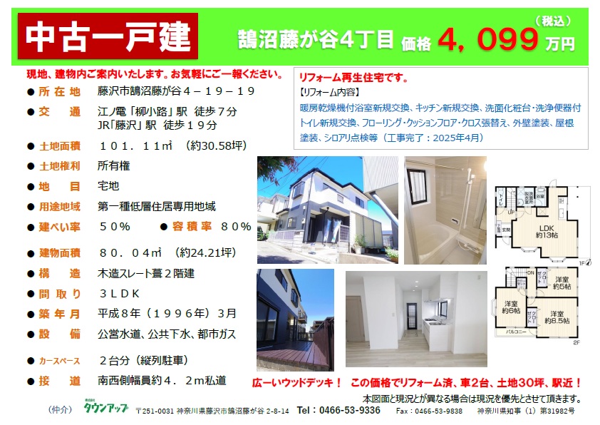 中古一戸建(売買)鵠沼藤が谷4丁目・4,099万円・リフォーム済・土地30坪、車2台・駅近・Wデッキ