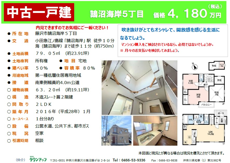 中古一戸建(売買)鵠沼海岸5丁目・4,180万円・解放感ある吹き抜け天井