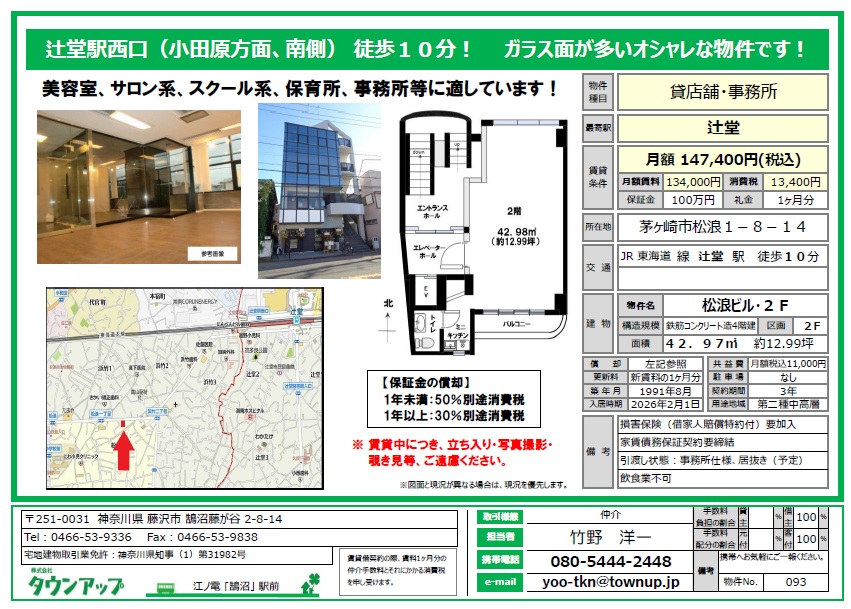 店舗(賃貸)辻堂駅・2階・13坪・ガラス張りのオシャレなビル