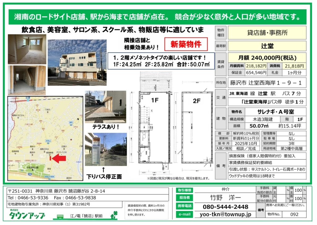 店舗(賃貸)辻堂駅・飲食店可・15坪・1-2階メゾネットの楽しい店舗物件