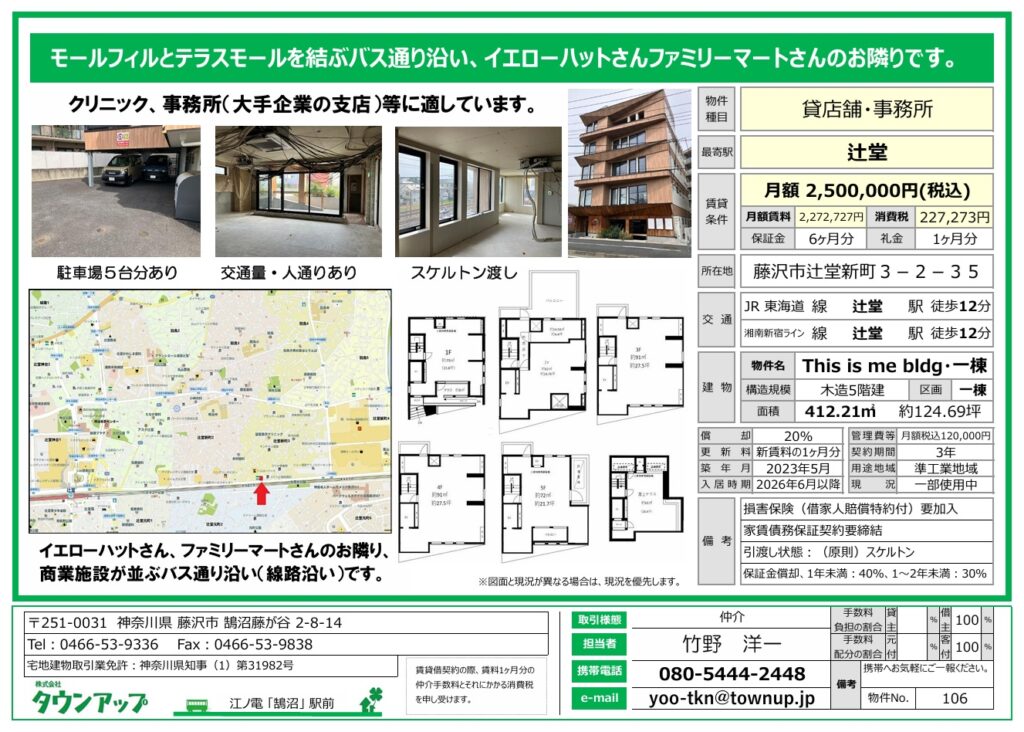 店舗(賃貸)辻堂駅徒歩12分・クリニック・支店事務所に適しています。1~5階一棟貸し